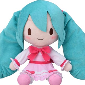 Este peluche destaca por su estilo chibi y su vestido rosa coqueto, capturando la esencia adorable de Miku. Su textura suave y abrazable lo convierte en el compañero perfecto para fans y coleccionistas.