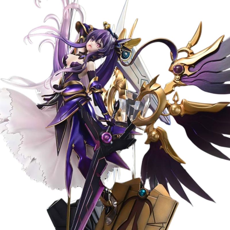 Tohka aparece en una pose poderosa y majestuosa, empuñando ambas espadas y evocando a sus ángeles gemelos, Sandalphon y Nahemah. Sus alas desplegadas y el trono que se insinúa detrás refuerzan su presencia divina y dual.