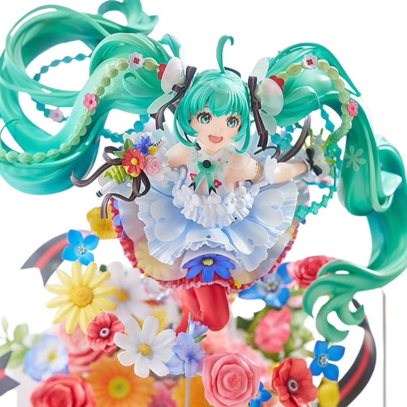 Con una impresionante altura de 32 cm, esta figura muestra a Hatsune Miku con un vestido floral multicolor que simboliza la vitalidad de la primavera japonesa. Su cabello turquesa fluye en espirales dinámicos mientras flota sobre una exuberante base repleta de flores en tonos vibrantes.