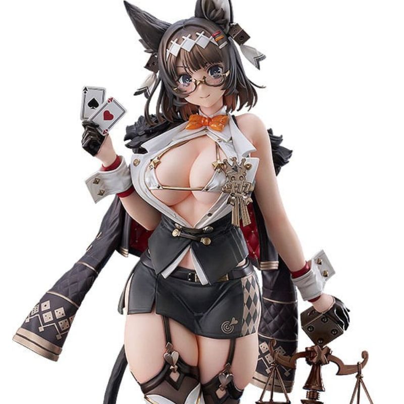 Alice-chan luce un espectacular atuendo de mágica juez de casino, combinando elegancia y picardía con su conjunto en blanco y negro decorado con motivos de cartas y balanza. Su expresión confiada, las orejas felinas y los detalles en dorado destacan la calidad del modelado y la pintura.