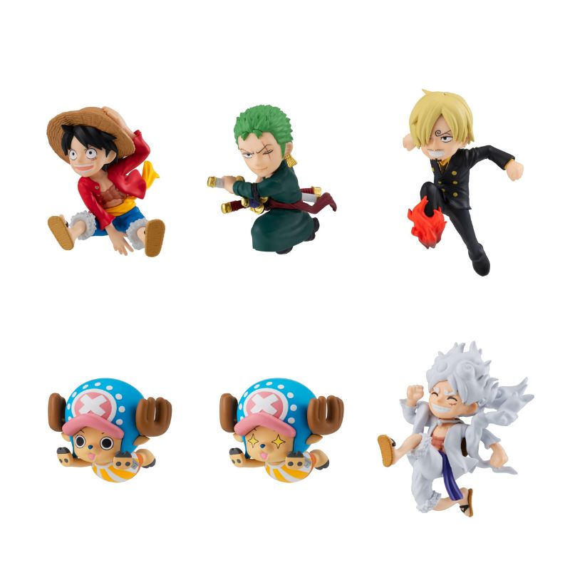 Este set incluye 6 modelos sorpresa con personajes como Luffy, Zoro, Sanji, Chopper y Luffy Gear 5, todos recreados en poses dinámicas llenas de energía y humor.