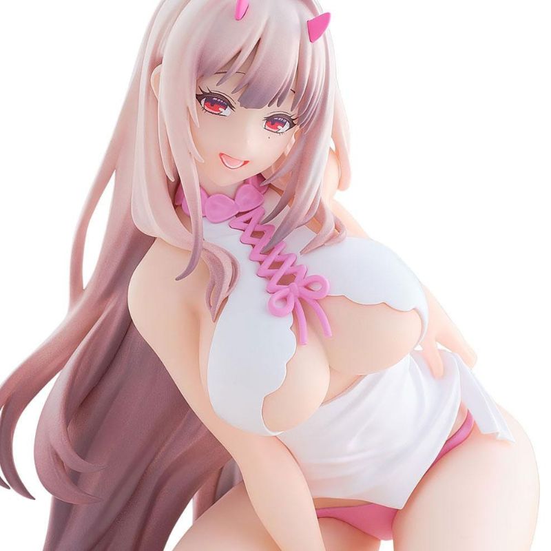 Los complementos que destacan incluyen sus cuernos de demonio, su larga melena y su base de apoyo que permite exhibirla fácilmente. Su combinación de colores —rosa suave, blanco y matices oscuros— da un toque sofisticado al conjunto.