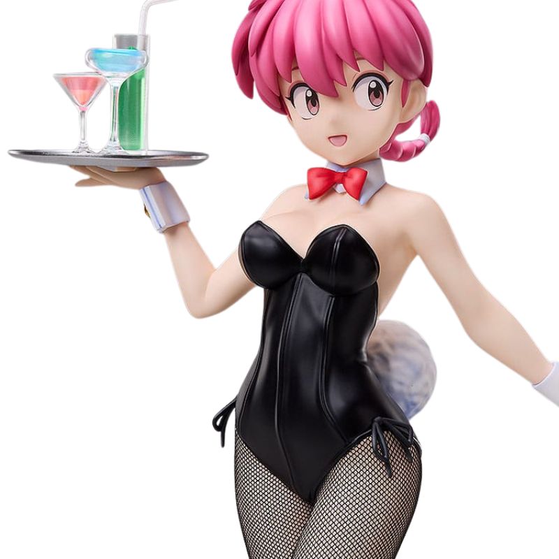 Con una altura de 44 cm, Ranma aparece vestido con un traje negro de conejita que resalta su figura, acompañado de medias de red reales y zapatos de tacón rojo brillante que aportan un contraste vibrante.