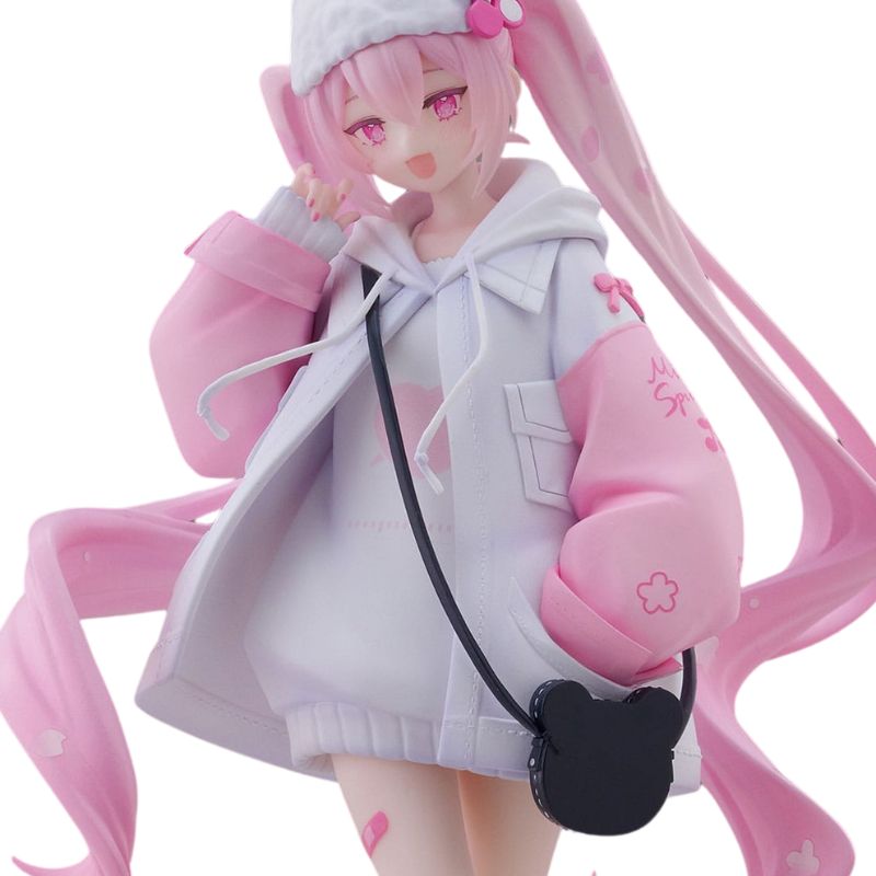 Con una altura aproximada de 19 cm, esta figura muestra a Miku con un estilo urbano y casual, luciendo una sudadera blanca oversize combinada con una chaqueta rosa pastel decorada con motivos florales de cerezo.