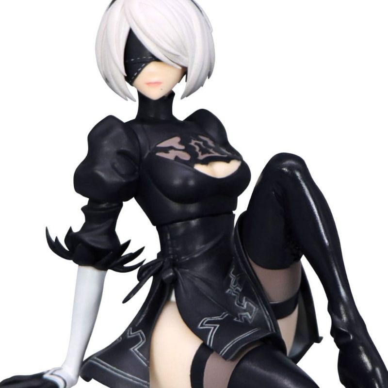 Con una altura aproximada de 13 cm, esta figura muestra a 2B en una elegante pose sentada, luciendo su icónico traje negro con detalles plateados y botas altas, mientras su venda cubre parcialmente su rostro, transmitiendo misterio y fuerza.