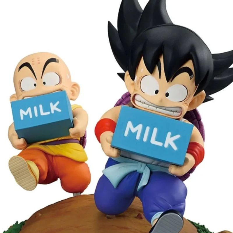 Ambos personajes aparecen en plena carrera, cargando cajas de leche con expresiones llenas de esfuerzo y determinación. Goku muestra su clásico peinado alborotado y su sonrisa confiada, mientras Krillin refleja concentración y energía.