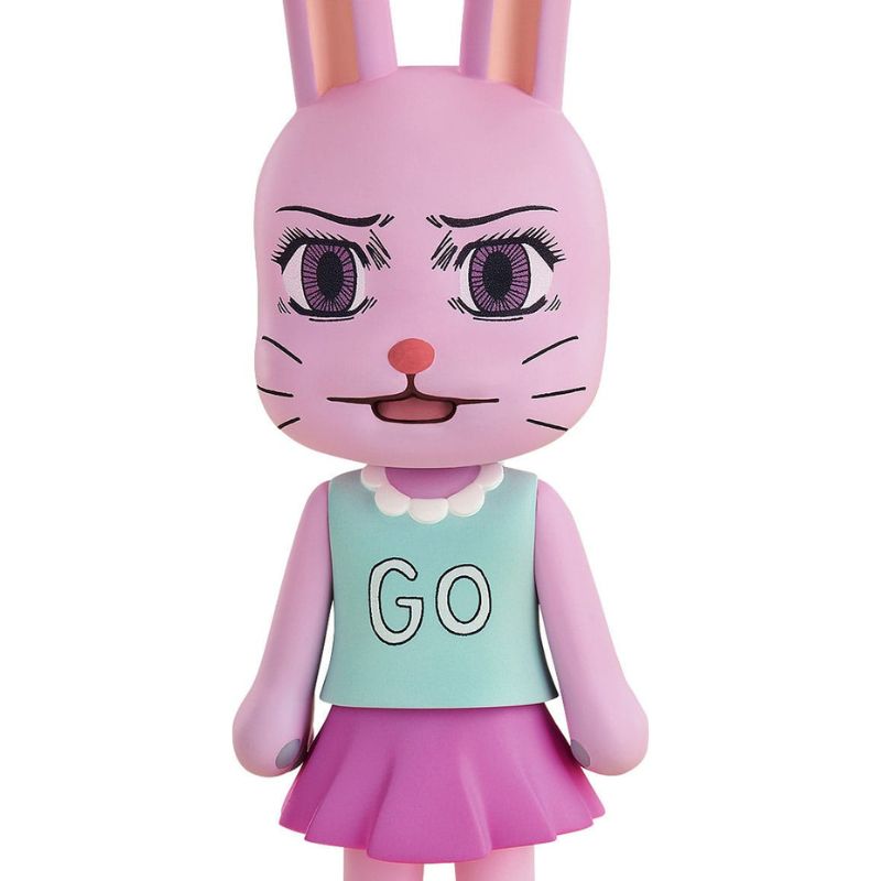La figura presenta un diseño de cuerpo compacto con orejas de conejo, falda rosa y camiseta azul con la palabra “GO”, todo cuidadosamente modelado para reflejar la estética simple y exagerada del anime. Incluye una base de exposición estable para su colocación en vitrinas o escritorios.
