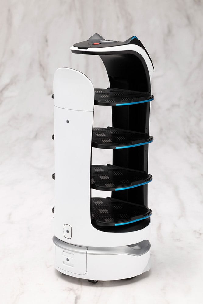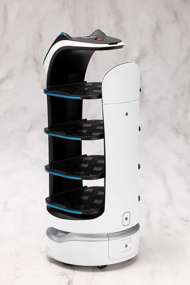 Presentamos la Maqueta BellaBot Grande Scale de Pudu Robotics, una réplica detallada de su famoso robot asistente.