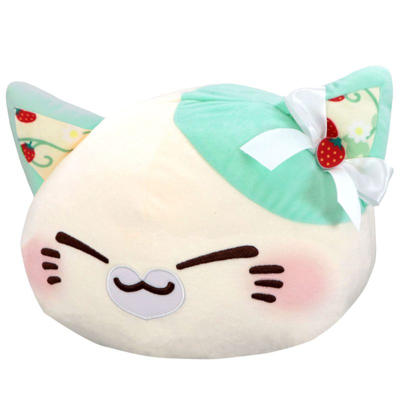 Este modelo de la línea Nemuneko luce un delicado tono verde menta, orejas decoradas con estampado de fresas y un lazo blanco que realza su aspecto dulce y acogedor.