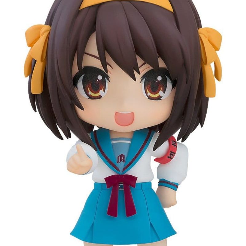Con una altura aproximada de 10 cm, Haruhi luce su icónico uniforme escolar y una expresión alegre que refleja su personalidad decidida y entusiasta.