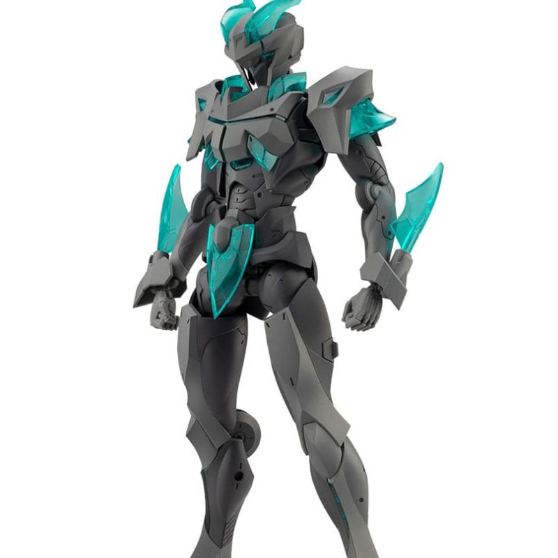 Este model kit de aproximadamente 18 cm destaca por su diseño oscuro y futurista con piezas translúcidas en color turquesa que aportan un estilo tecnológico único.