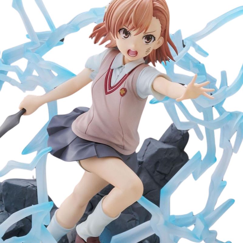 Fabricada por SEGA, esta figura destaca por su espectacular base con efectos eléctricos translúcidos que recrean el poder electromagnético de Misaka en pleno combate.