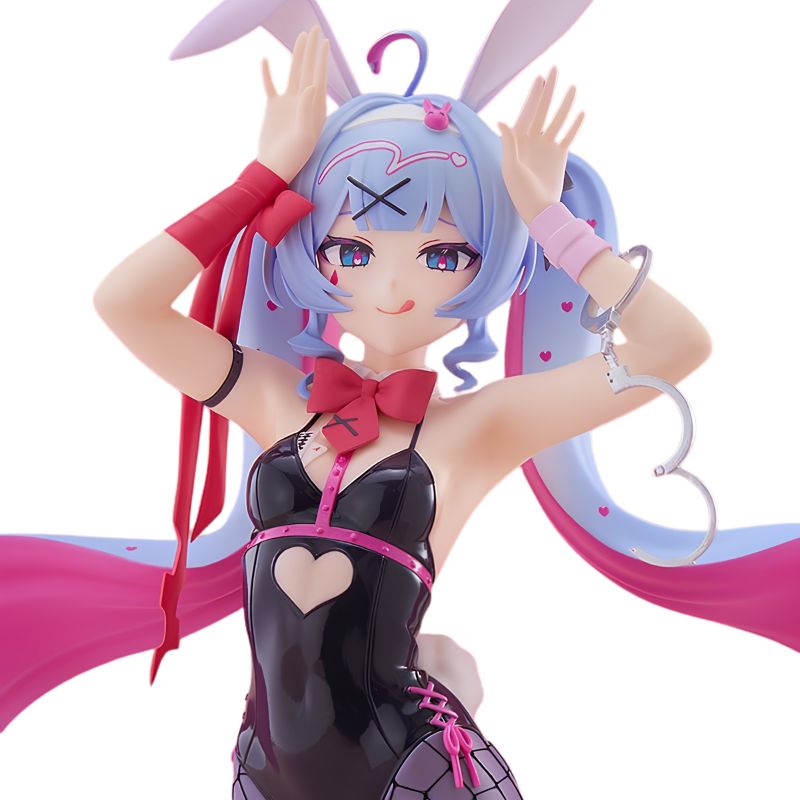 Miku se presenta en una elegante versión Rabbit Hole, con un dinámico diseño que resalta su silueta estilizada, medias de red, acabado brillante y una composición visual protagonizada por su icónico cabello en forma de corazón.